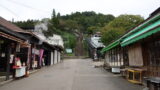 再度合流するポイントがここで、この辺りが温泉街の端っこです。ちなみに、写真右側の旅館は閉館しており、玄関先の車にはナンバーが付いていませんでした。
