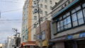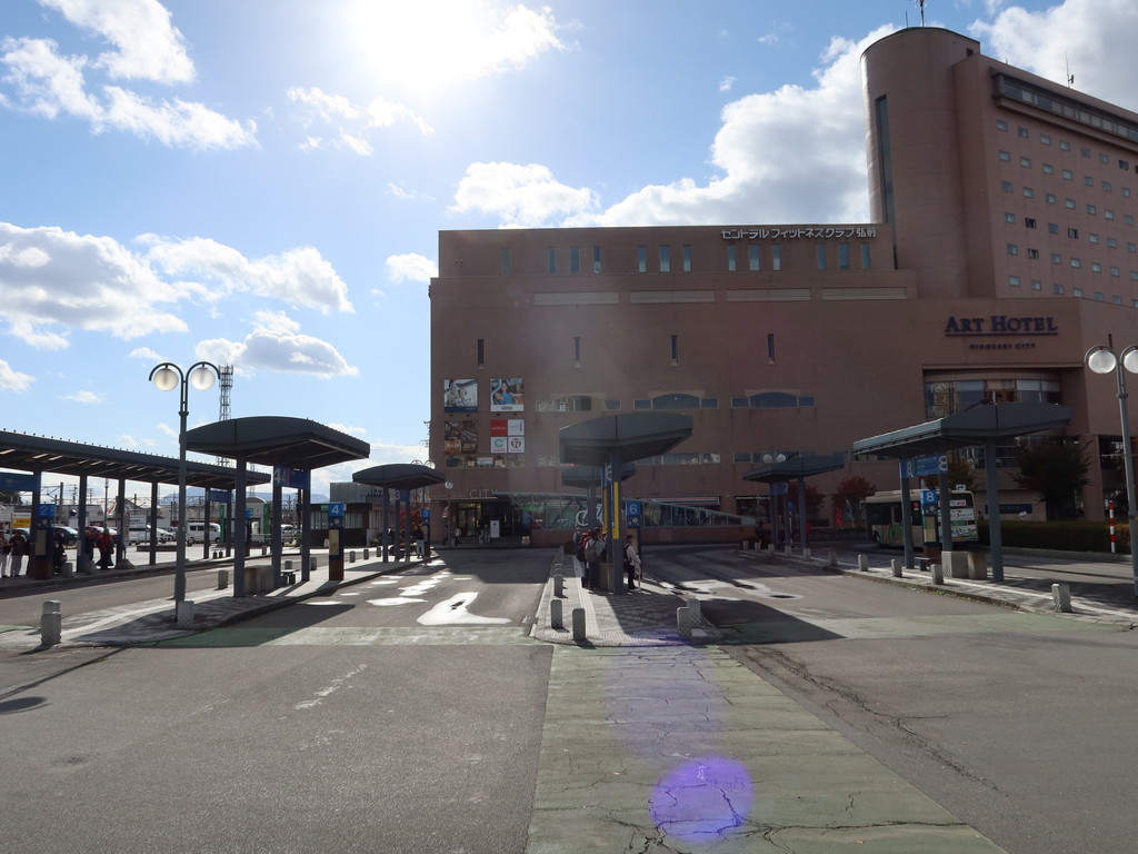 城東口の駅舎です。向かって左側が弘南鉄道の駅舎、中央がJR東日本の駅舎です。